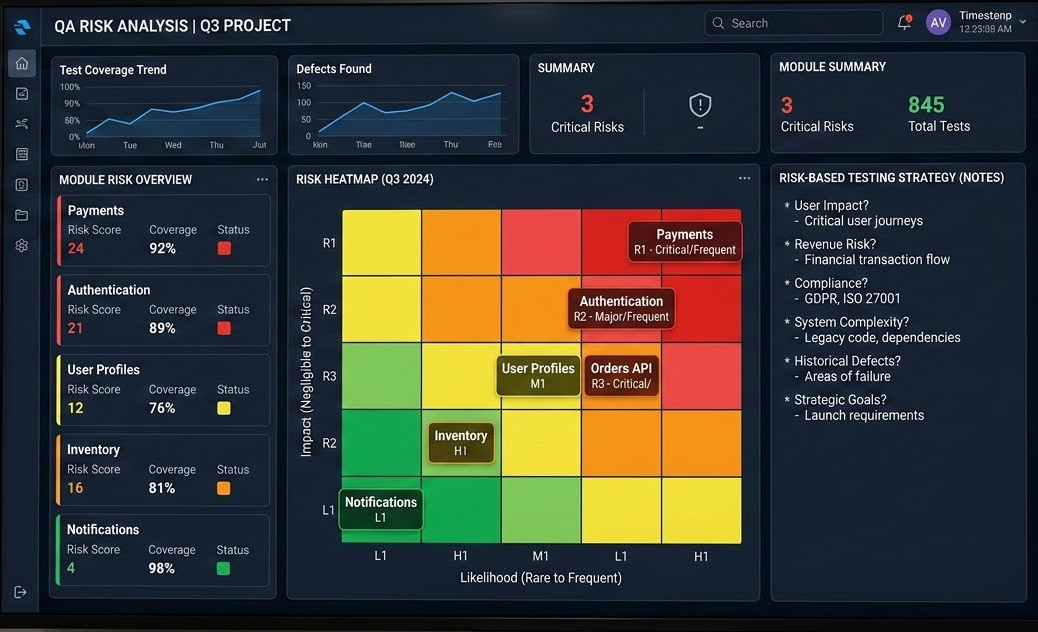 Risk-based testing is not a checkbox—it’s a mindset. I prioritize testing based on impact × likelihood.