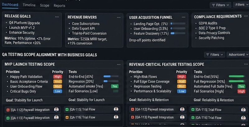 I never define test scope in isolation. I align it with: